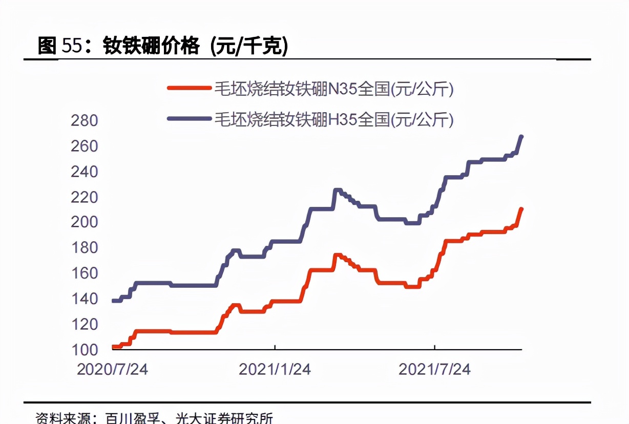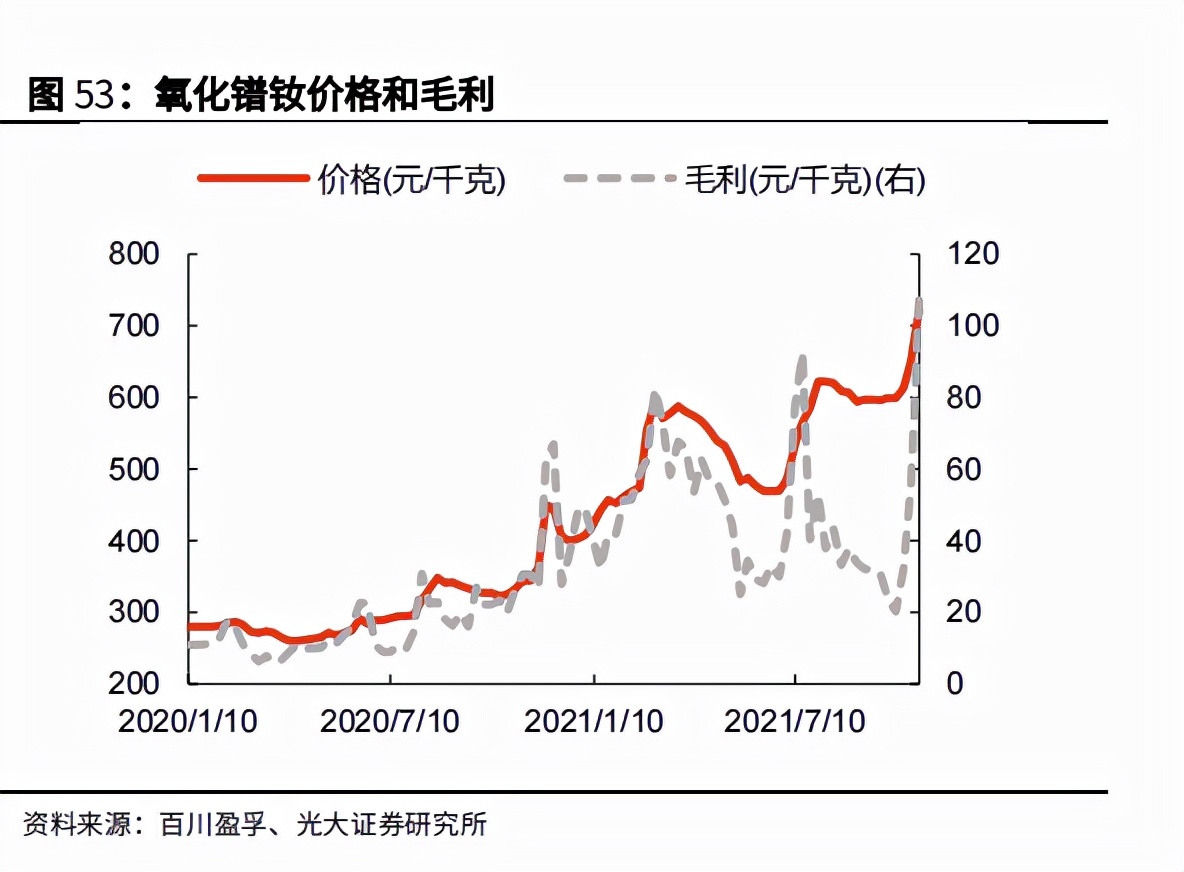 钕铁硼上游材料主要为金属镨钕,金属镨钕由氧化镨钕制备。根据相关资料,钕铁硼毛坯约 2/3 可制备钕铁硼磁材,每单位毛坯约含金属镨钕 25%,每制备 1单位金属镨钕需要 1.2 单位氧化镨钕。按此计算,每吨钕铁硼需要消耗 0.45 吨氧化镨钕。因此,钕铁硼价格减去 0.45*氧化镨钕价格可以作为钕铁硼永磁材料的毛利上限。