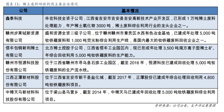 公司的竞争对手并不是很多,有 盛和资源(600392.SH)、华宏科技(002645.SZ)、赣州步莱铽新资源、包钢股份(SH:600010)、正潭股份(NQ:872933)、中稀天马(NQ:872222)等。根据 2014 年工信部原材料工业司在《工业和信息化部关于清理规范稀土资源回收利用项目的通知》中披露:据初步统计,国内现有 67 个处理工业废料的稀土资源回收项目,分布于 11 个省(区),主要回收利用钕铁硼、荧光粉、抛光粉等工业废料,其中年处理钕铁硼废料能力 20 多万吨。
