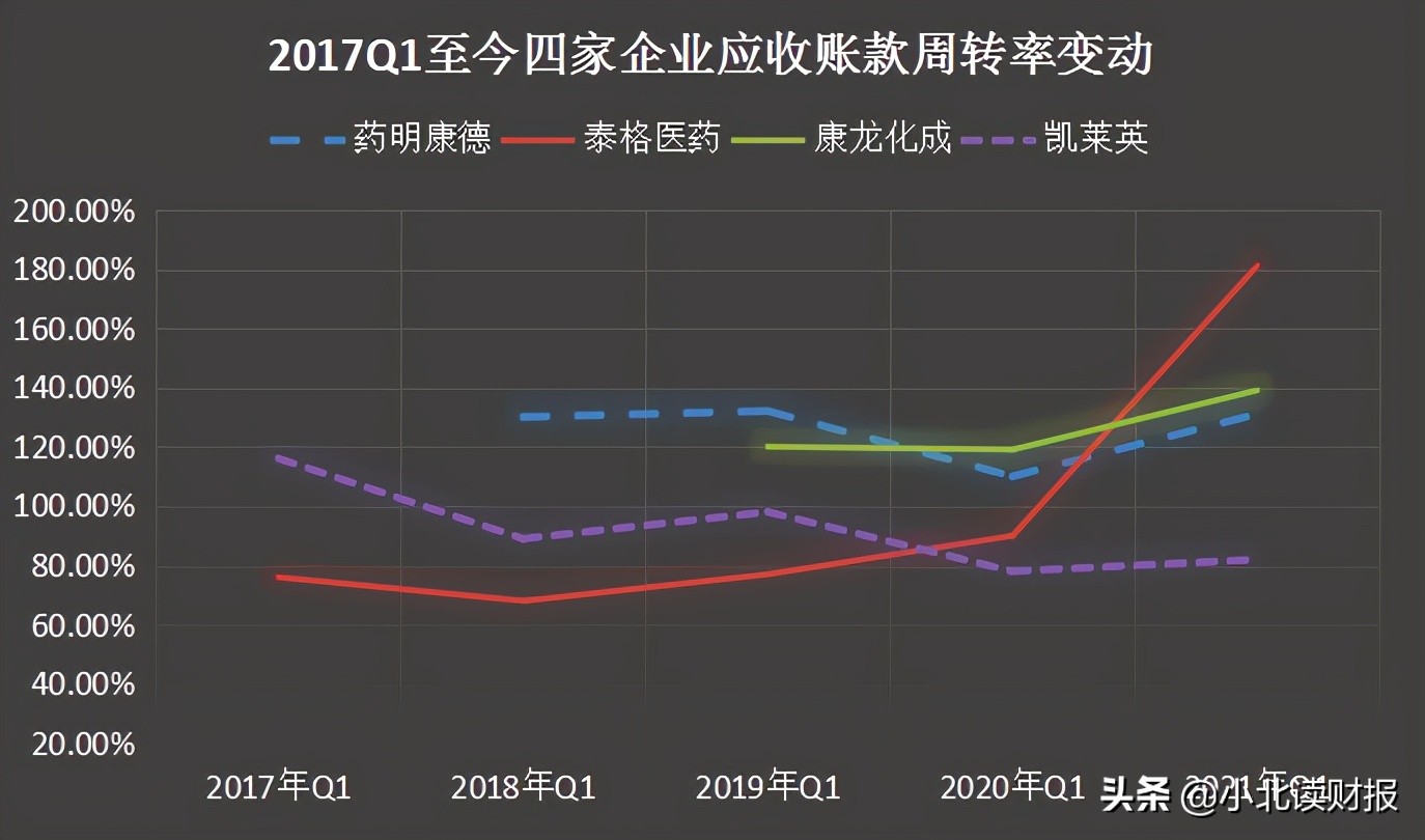除此之外,我们还要结合应收账款周转率的变动情况来看,数据显示,泰格医药的应收账款周转率有一个明显提升的趋势,康龙化成和药明康德周转率的提升则主要表现在今年1季度,而凯莱英的应收账款周转率则呈现一个持续下滑的趋势。