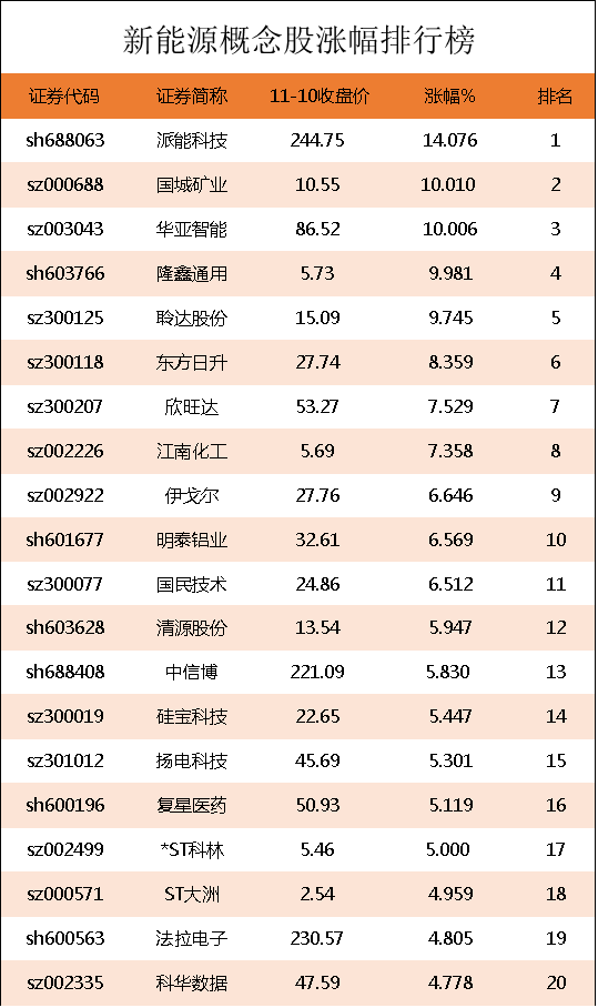 新能源概念股涨幅排行榜