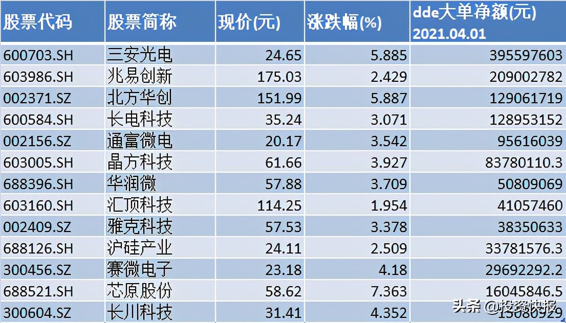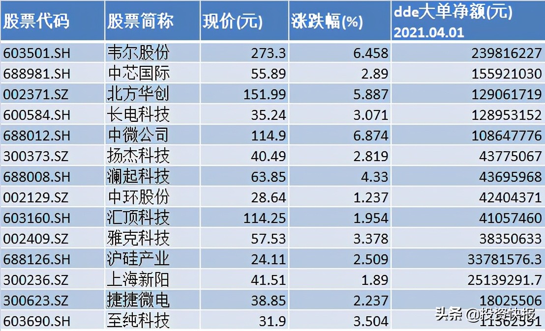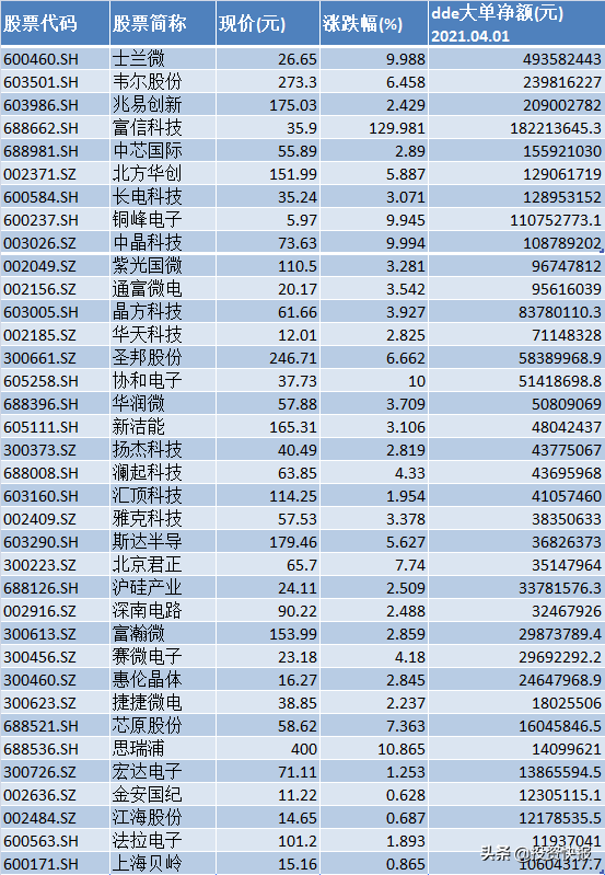 中芯国际概念股方面,4月1日,板块内共有14只个股的大单资金净流入额超过1000万元,合计吸金达10.60亿元。其中5只概念股大单资金净流入额超亿元。