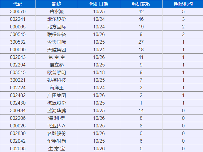 好股【机构调研1027】统计显示,25家上市公司被机构调研,其中碧水源、歌尔股份、北方国际、联得装备、今天国际、天健集团、兔 宝 宝、信立泰、欧普照明、银禧科技、海洋王、广田集团等13家受明星机构青睐。
