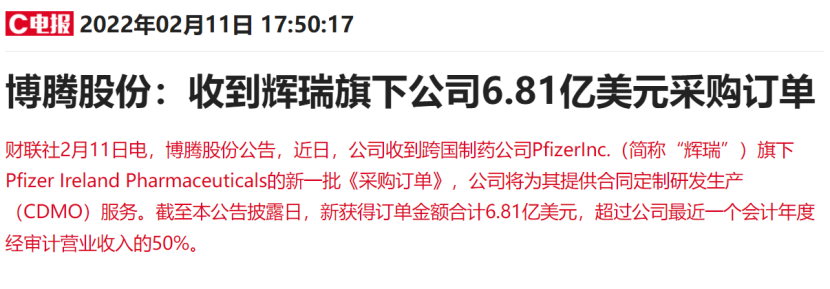 值得注意的是,博腾股份此前发布的业绩预增公告披露,预计2021年全年实现营业收入为30.04亿元至31.08亿元,显然,这笔大单远远超过博腾股份去年一整年营收。