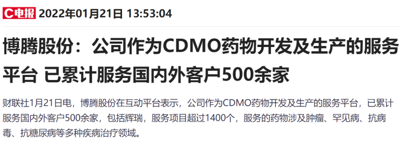 博腾股份1月在互动易上表示,公司作为CDMO药物开发及生产的服务平台,已累计服务国内外客户500余家。