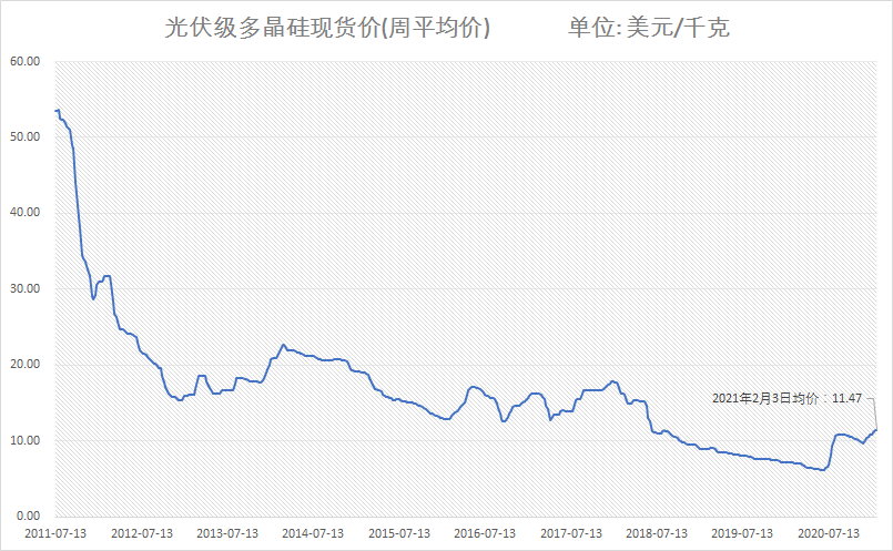 Wind数据显示,光伏级多晶硅料在2011年突破50美元/千克后,价格持续下降,期间虽有部分年份出现反弹,但总体呈现不断下跌走势。2019年后价格跌势放缓,2020年下半年开始,光伏级多晶硅料价格开始反弹,最新平均价格报11.47美元/千克。