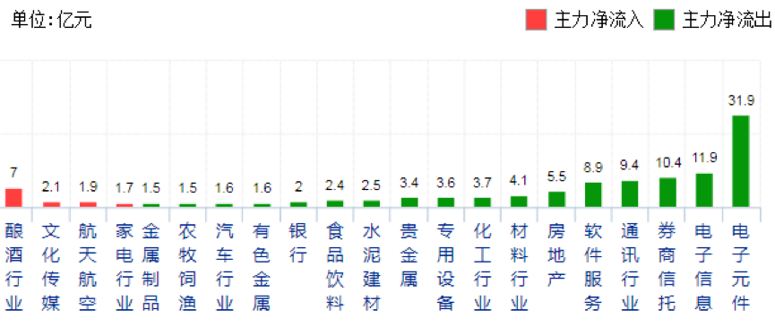 两市主力净流出106亿,其中超大单净流出25亿,大单净流出80亿;酿酒文化净流入7亿,而电子元器件行业净流出31.9亿,电子信息行业净流出11.9亿,券商净流出10.4亿。