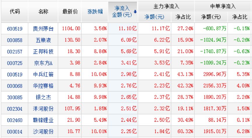 资金净流入前10