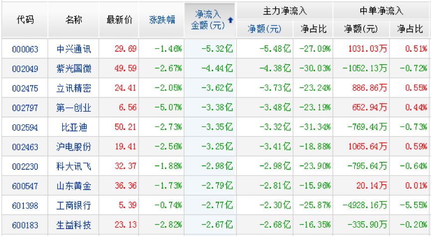 资金净流出前10