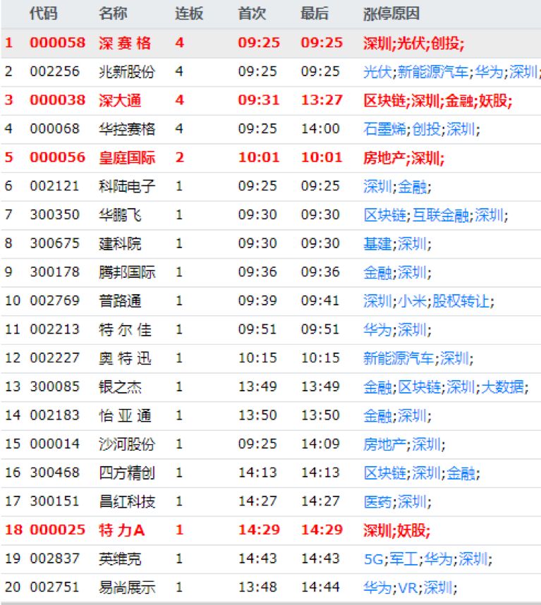 深圳板块重新崛起,对人气带动明显;两市50只个股涨停,其中开板15只,封板率76.92%,连板个股也有10只,整体来看人气还不错,不过热点爆发力比较好的还是深圳+华为等重点板块,其他题材爆发可以,不过持续性不佳;题材方面,深圳、华为为主的科技股继续活跃,成为目前最好的爆发题材,另外,新能源、军工、区块链、以及金融和区块链等题材活跃,整体来看题材爆发情况还不错,只是持续性还有待考验。