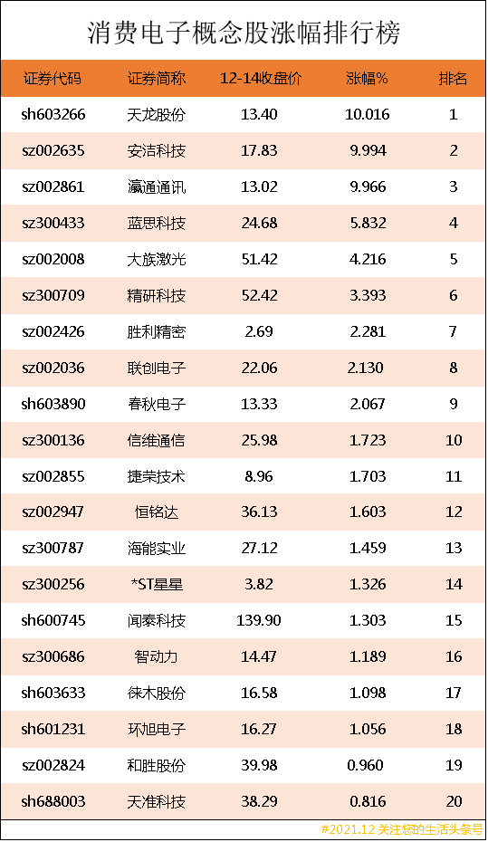 以上就是为读者们带来的消费电子概念股涨幅排行榜的相关信息,本文是根据有关数据及近期事件所撰写分析文章,并不构成投资建议,据此操作,风险自担!(本文属于非商业性文章)