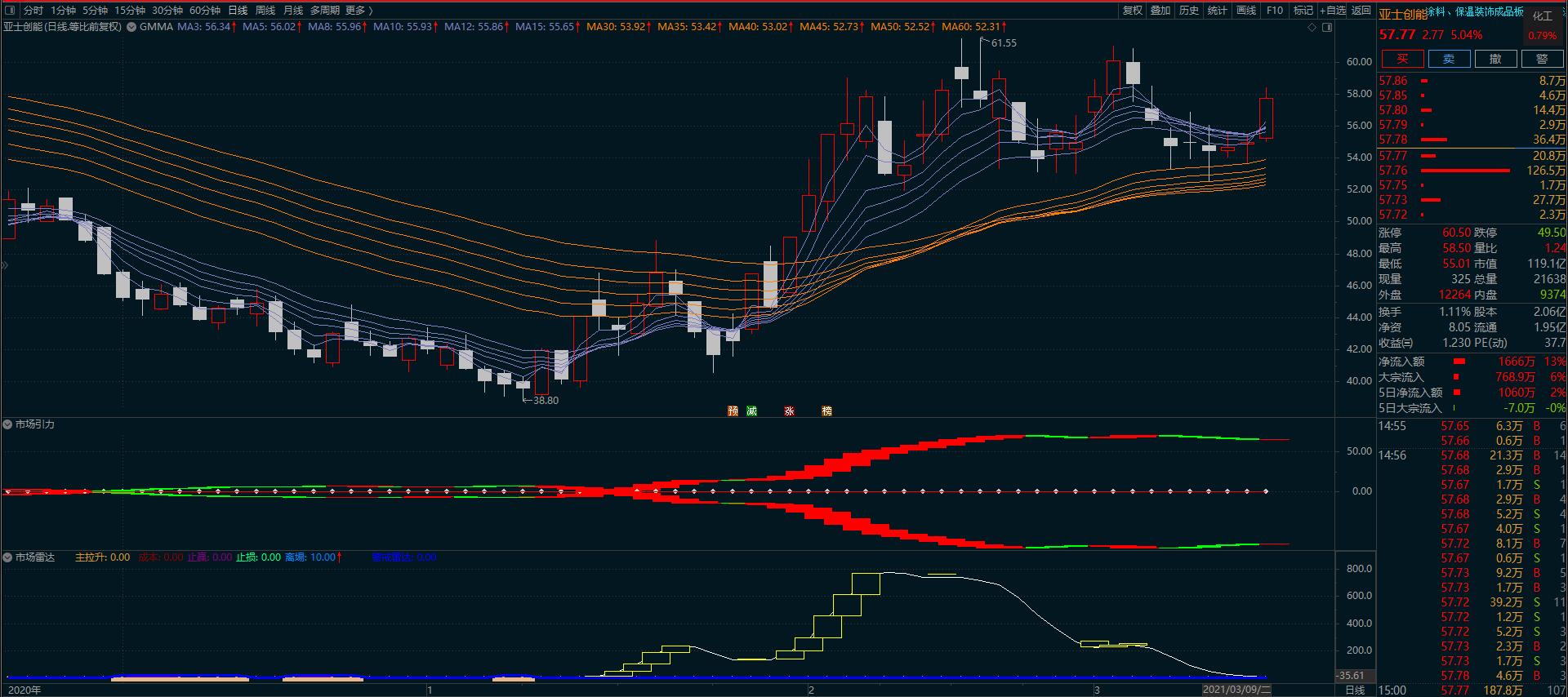 A股上市公司工程涂料龙头股亚士创能保持中期上升趋势,主力机构阶段性控盘,据大数据统计,主力筹码约为48%,主力控盘比率约为54%,趋势研判及多空研判方面,可以参考中短期成本线及中期成本线,结合市场引力与市场雷达做综合研判。