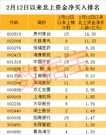 从这些个股上榜活跃股榜单的次数看,2月12日以来的15个交易日均有上榜的共8只个股,分别是贵州茅台、海康威视、中国平安、五粮液、招商银行、美的集团、格力电器、伊利股份。值得注意的是,这些个股几乎都是各大行业的龙头。