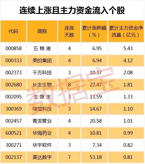 值得注意的是,298只连续上涨个股中,7只个股期间主力资金累计净流入超过亿元。其中,累计资金流入最多的为五粮液,主力资金累计流入5.43亿元。