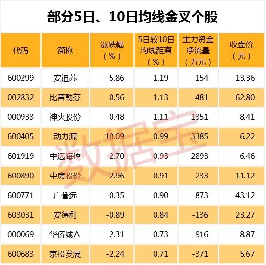 截至3月9日收盘,有107只A股的5日均线主动上穿10日均线,其中安迪苏、比音勒芬、神火股份等个股的5日均线较10日均线距离最大,分别达1.19%、1.13%、1.11%。