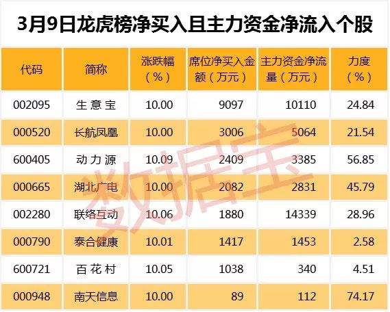3月9日龙虎榜中机构及营业部席位资金净买入2.27亿元,其中净买入的个股有11只;净卖出的个股有5只。净买入前三名个股分别是东阳光科、生意宝、长航凤凰,净买入金额占当日成交额比例达15.38%、22.35%、12.79%。
