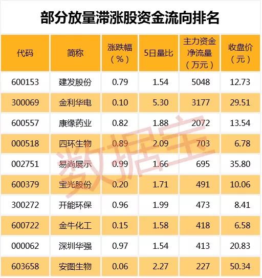 值得注意的是,79只放量滞涨股中,建发股份、金利华电、康缘药业等个股主力资金净流入最多。