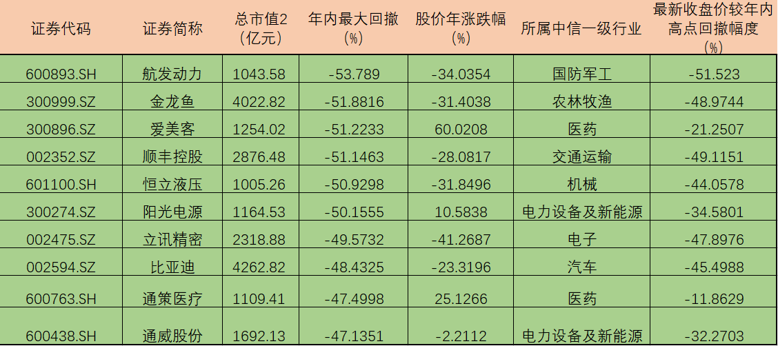 第一财经记者根据年内最大回撤幅度、最新股价较最高点的回撤幅度两项数据对比千亿龙头股表现。其中,股价年内最大回撤幅度是指年初以来股价最低位较最高位的调整幅度;最新股价较最高点的回撤幅度,更能体现出个股跌至年内新低位后是否出现修复式上涨行情。