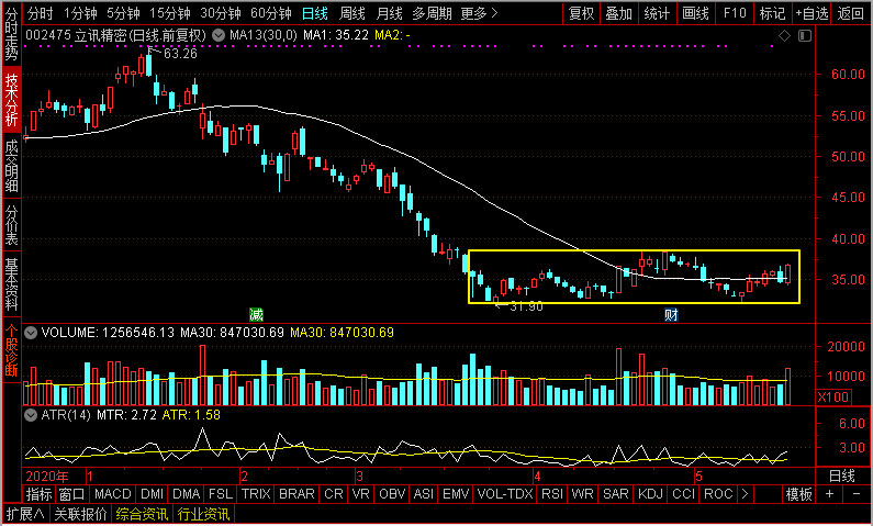 如果说,立讯精密从今年年初就一直跌跌不休地处于下降阶段,那么自从进入5月,立讯精密已经由前期的下降阶段进入到横盘整理阶段了。因为,均线已经由下降转为走平,同时价格也在均线附近上下震荡。