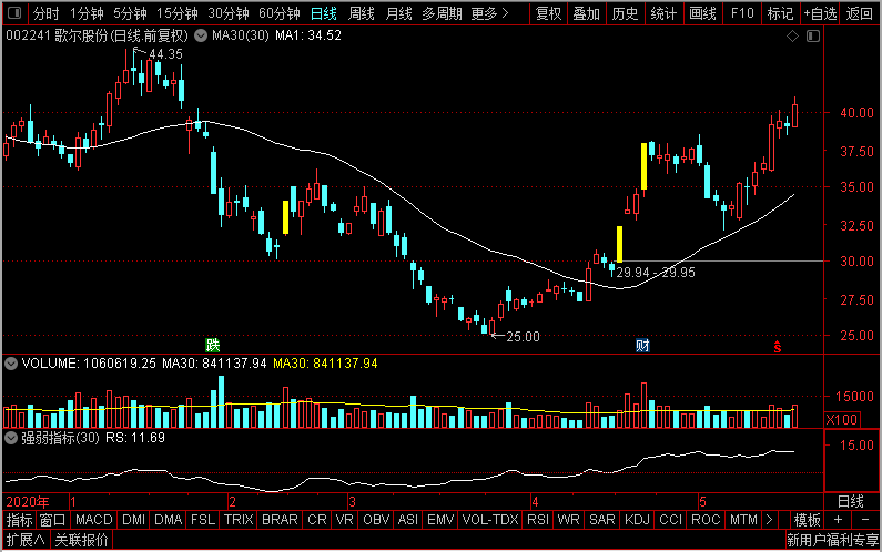 那么歌尔股份,目前的阻力和支撑位分别在哪呢,目前它依托30日线向上,那么均线是具有中长期的支撑的,而阻力,着看前期高点位置。