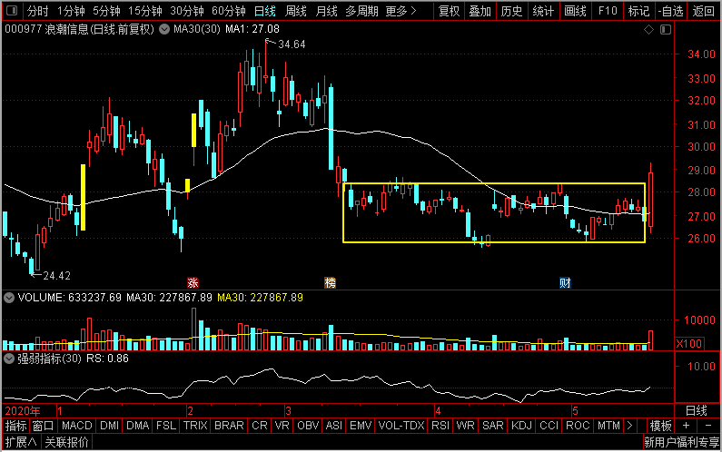 可以看到,浪潮信息这段时间同样也是在走横盘整理阶段,均线走平,价格在均线上下振荡。不过,最近有了一些变化。可以看到,最近的价格向上突破了横盘的上边界,同时,成交量也明显放大。有突破横盘整理阶段的迹象。
