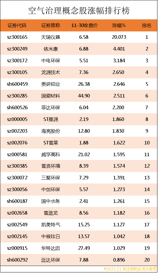 空气治理概念股涨幅排行榜