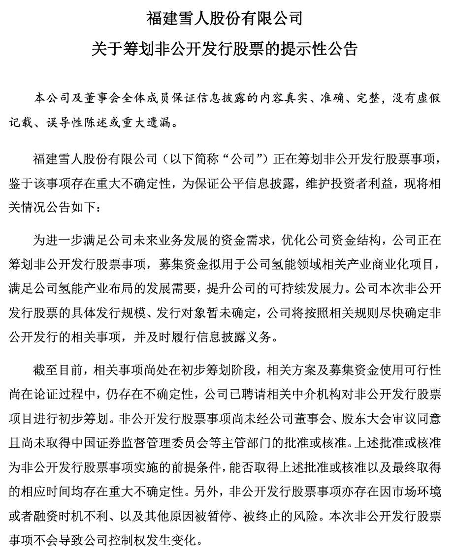 雪人股份表示,截至目前,相关事项尚处在初步筹划阶段,相关方案及募集资金使用可行性 尚在论证过程中,仍存在不确定性,公司已聘请相关中介机构对非公开发行股票 项目进行初步筹划。