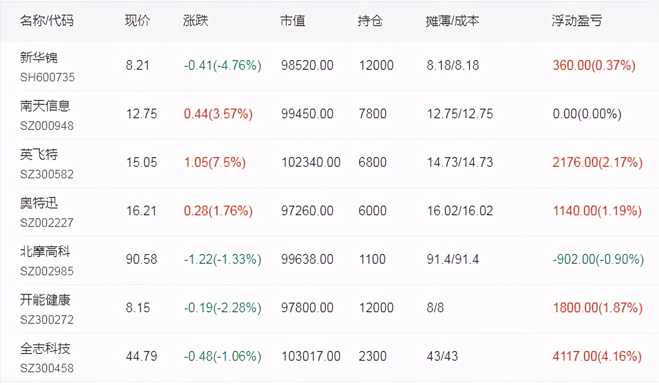 持仓个股状况:全志科技300458、开能健康300272、北摩高科002985、南天信息000948、新华锦600735、奥特迅002227和英飞特300582,手中个股全部依托5日线持仓。持仓股遇大涨明显偏离5日线可考虑兑现止盈。