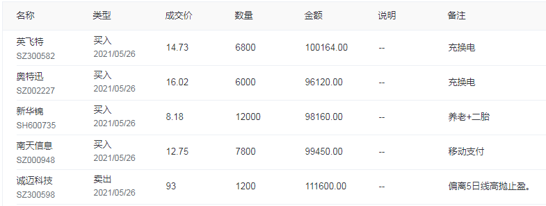 总体来看,昨天出润和虽然少吃了一大块肉,但把诚迈留下还是正确选择,今天高抛诚迈是最大获利点,持仓其他个股整体表现平淡。布局部分安排了两个充换电仓位,今天都达成布局条件,整体收益率基本维持在高位。短线来看,我的操作目标还是集中在上面提到的这些热点中,寻找龙头股或者热门股的节奏轮动机会,高抛低吸做波段。