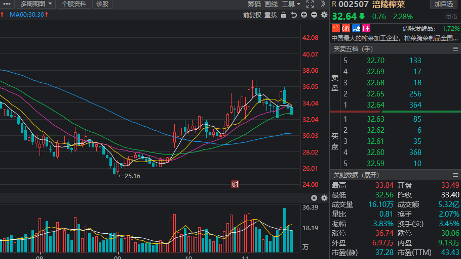 涪陵榨菜:11月北向资金净买入量为457.73万股,总市值为296.47亿元