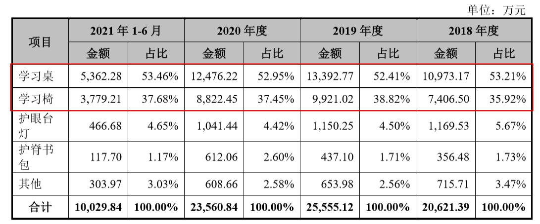 招股书显示,护童科技的主营业务收入以学习桌、学习椅为主,这两类产品的收入合计占比超86%。