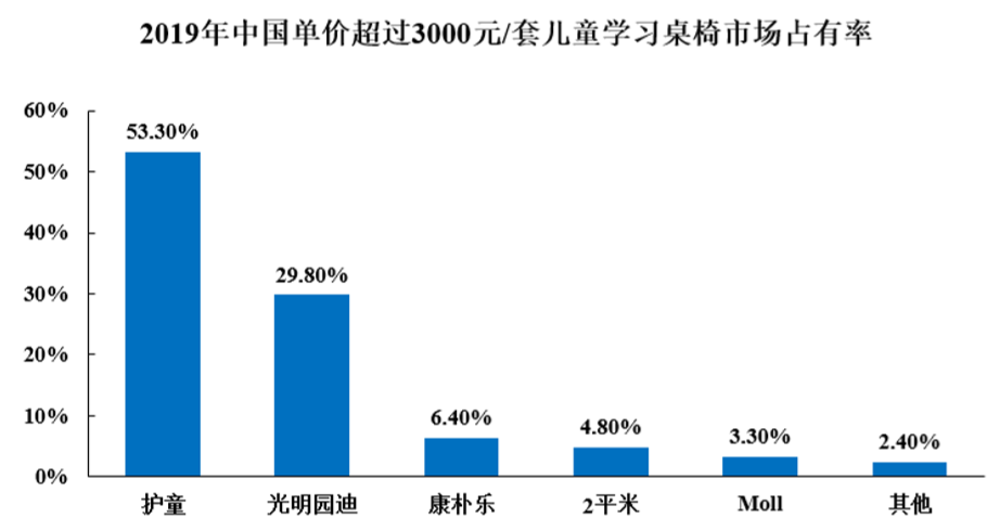 据艾瑞咨询测算,2019 年零售价在 3000 元/套以上的儿童学习桌椅市场占有率中,护童科技的市场占有率高达53.3%;而前五大公司合计市场占有率近98%。