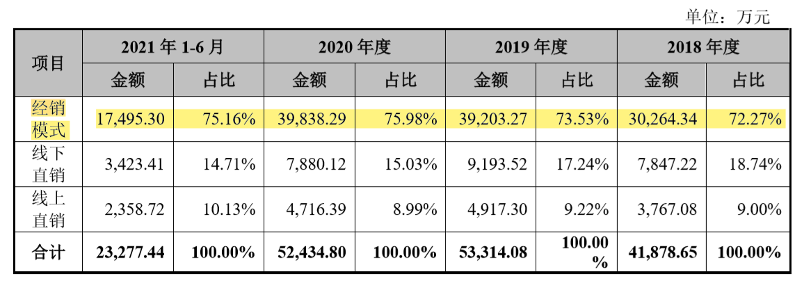 近三年来,其经销模式收入占比在72%-76%之间,对经销模式的依赖可见一斑。