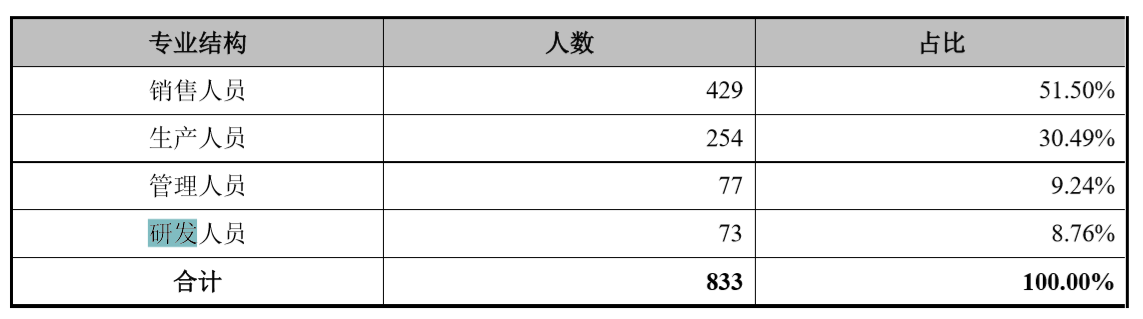 截至今年6月30日,护童科技的研发人员占比为8.76%,而销售人员占比高达51.5%。