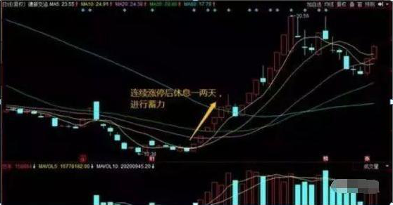 连续涨停后休息一两天,是为了给后面蓄势,吸引更多的资金入场。但是休息不能将上升趋势搞没了。休息要体现出强势的休整,最好的调整方式是一天都在均线上下浮动,收盘收出高位十字星。这样的调整一般就是要往5日均线上奔去,只有找到了5日均线,才感觉到了稳定,才踏实。