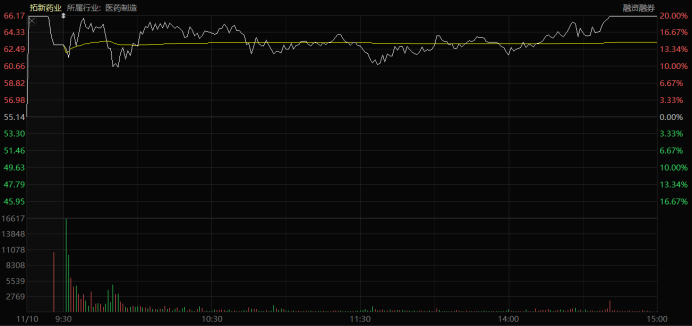 财联社(上海,编辑 梓隆)讯,近期,市场对于次新股的热度再度升温,上个月刚上市的拓新药业近日也持续走强,截止今日(11月10日)收盘,连续四个20cm涨停,收盘价66.17元,较之此前发行价19.11元上涨近246%。
