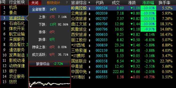 2月15日,A股市场反弹,但旅游酒店板块个股集体调整。此前连续三天涨停的凯撒旅业(000796)早盘小幅低开后迅速大跌,开盘仅6分钟就封跌停,收盘以9.97%的跌幅跌停,卖盘封单超11万手,最新市值85亿元。
