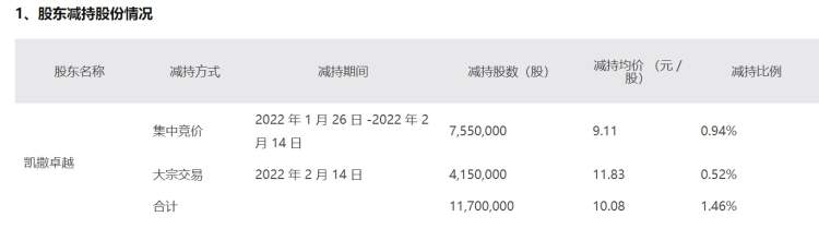 当天晚间凯撒旅业公告,公司接到控股股东的一致行动人凯撒卓越的通知,其近期(1月26日到2月14日)已根据前期发布的减持计划以集中竞价及大宗交易的方式累计减持公司1170万股,占公司总股本的1.46%,减持股份数量已过半且量已超过公司总股份的1%。