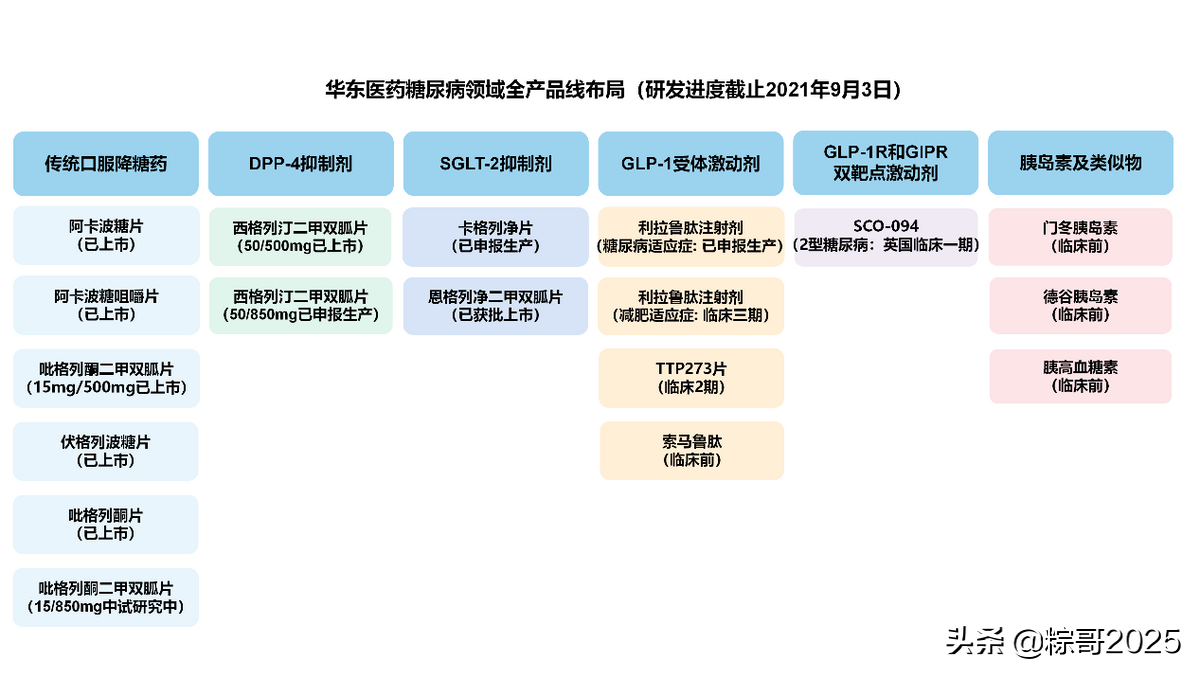 华东医药目前在糖尿病临床主流治疗靶点形成了创新药和差异化仿制药产品管线全面布局,从仿制+创新+生物大分子三个维度,构筑了逐步升级、对核心治疗靶点与临床主流用药全布局的产品矩阵,现有及后续升级产品涵盖-糖苷酶抑制剂、DPP-4i(二肽基肽酶Ⅳ抑制剂)、SGLT-2i(钠-葡萄糖共转运蛋白2抑制剂)、GLP-1R(人胰高血糖素样肽-1受体激动剂)以及GLP-1R和 GIPR(葡萄糖依赖性促胰岛素多肽受体)双重激动剂、胰岛素及其类似物等多项临床主流靶点。