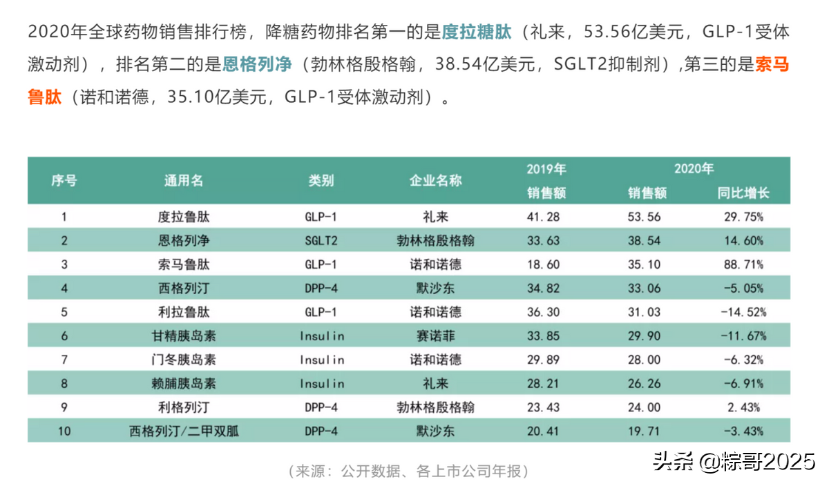 紧盯高壁垒、大品种是华东医药布局糖尿病市场产品的战略特点。2020年全球降糖药物销售排行榜前十名中,华东医药已布局索马鲁肽、利拉鲁肽、西格列汀二甲双胍、门冬胰岛素四大品种。