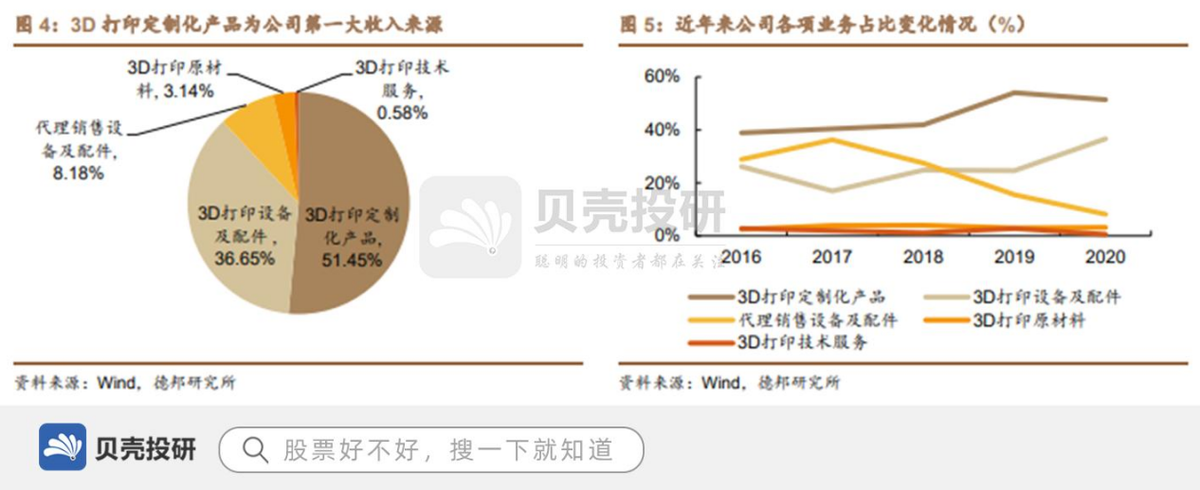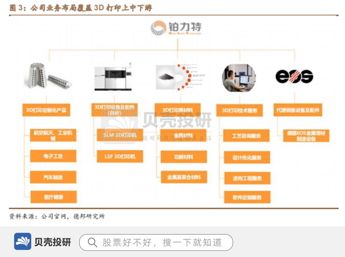 目前公司已经对3D打印上游原材料、中游设备、下游制造形成完整覆盖。成立至今的十年间,公司逐渐发展成为以3D打印设备及配件(自研)、3D打印定制化产品、3D打印原材料、3D打印技术服务、代理销售设备及配件为五大核心产品的多元化产业集团,业务范围涵盖金属3D打印服务、设备、原材料、工艺设计开发、软件定制化产品等,下游客户广泛分布于航空航天、机械、轨道交通、电子、汽车、医疗齿科及模具等行业。