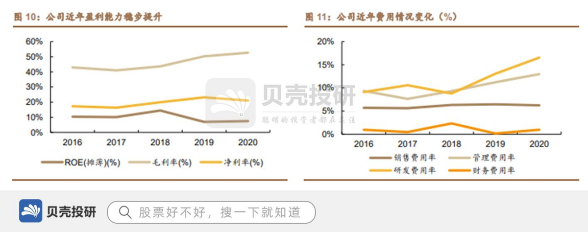 公司盈利能力稳步增长,研发投入逐年上升。随着公司技术的不断成熟,生产成本不断降低,高毛利的自主设备销售占比不断上升,公司毛利率逐年稳步提升,在2020年达到52.7%,净利率在20%的水平小幅波动。近年来公司研发、管理费用率呈不断上升趋势,主要系公司对研发与核心管理、研发人员激励的投入不断加大,2020年研发费用率达到16.6%,充分体现了公司对核心技术的重视。公司销售、财务费用率保持稳定,分别为6%、1%左右。