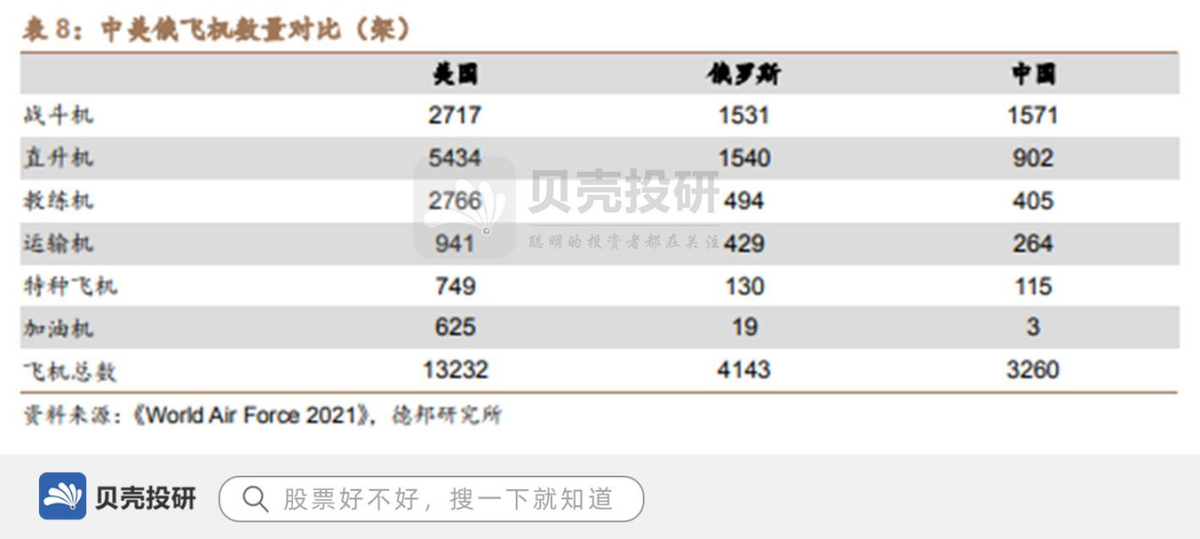 与美国相比,我国在运输机、直升机等类型的数量上还有较大差距。根据《WorldAirForce2021》数据,2020年,美国共有现役战斗机数量2717架,俄罗斯1531架,中国1571架,分别占全球战斗机总量的19%,10%和11%。而在运输机、通用直升机等领域,由于我国受到航空发动机性能的制约,部分型号依赖进口,飞机产能长期受限,与美、俄的差距则更大。