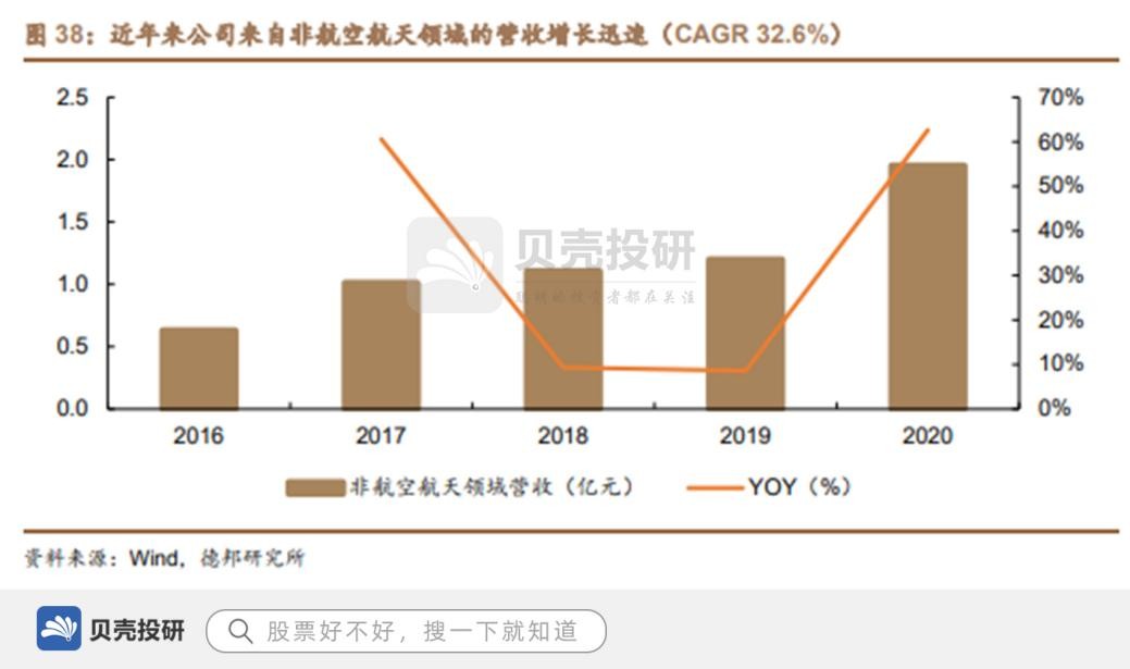 近年来公司来自非航空航天领域的营收规模保持快速增长。2016-2020年的4年间,公司来自非航空航天领域的营收从0.63亿元快速增长到1.95亿元,年均复合增速达到32.6%。特别是2020年,得益于对其他行业市场的大力开拓与应用挖掘,公司来自工业机械领域的营收达到1.15亿元,同比有81%的大幅增长,工业机械领域也成为公司第二大营收来源,占比达到27.9%,在一定程度上分散了公司营收过于依赖航空航天领域的风险。