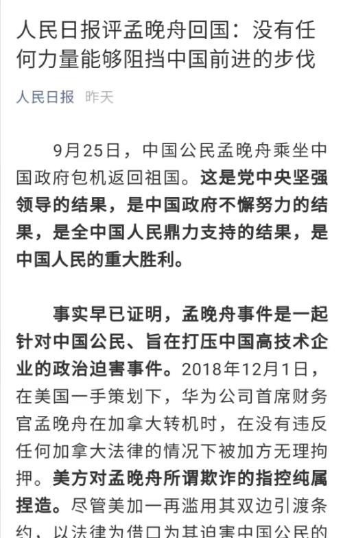 经中国政府不懈努力,当地时间2021年9月24日,孟晚舟乘坐中国政府包机离开加拿大。北京时间9月25日晚间,孟晚舟乘坐的包机顺利降落深圳机场,孟晚舟在机场深情发表归国感言。人民日报发表的评论称,“这是党中央坚强领导的结果,是中国政府不懈努力的结果,是全中国人民鼎力支持的结果,是中国人民的重大胜利”。