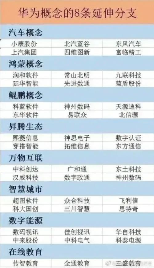 整个华为概念股来看,直接影响加间接涉及的产业链,包括5G通信、消费电子、芯片、鸿蒙系统、昇腾系统、华为汽车等等,涉及的上市公司上百家,以下为部分重点公司。