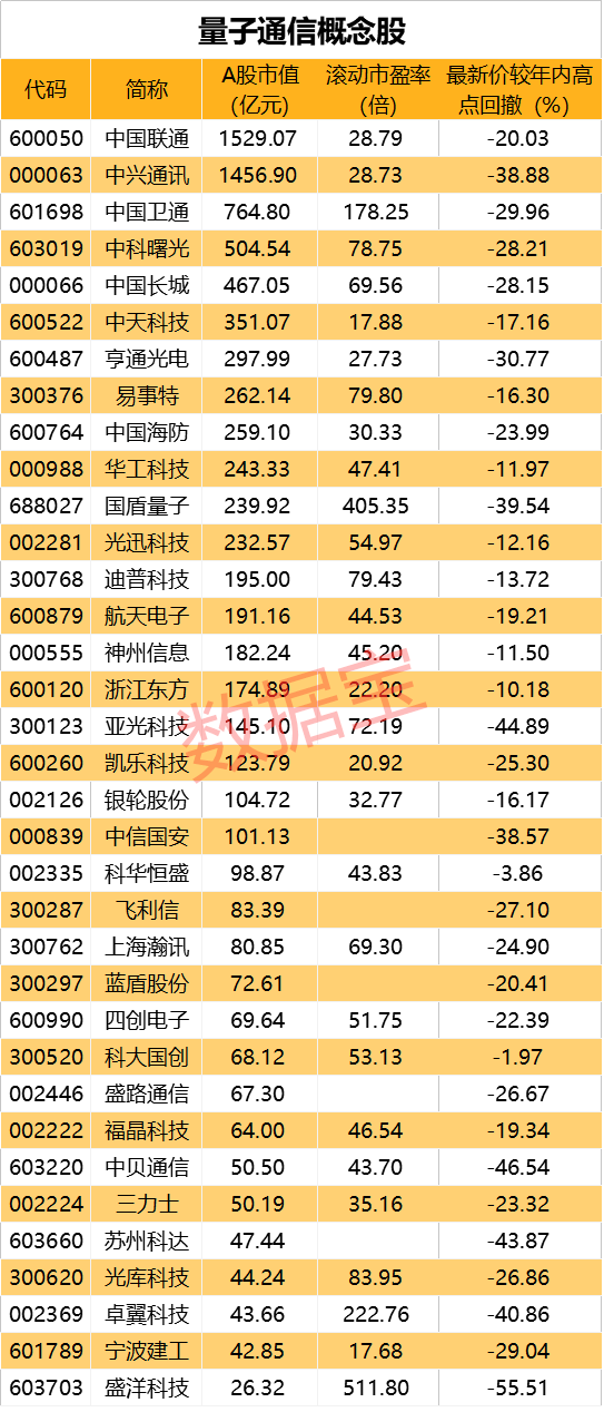 根据证券时报·数据宝梳理,A股中量子通信概念股共35只。总市值规模达到8736.49亿元,其中中国联通和中兴通讯的市值均达到千亿级别,市值分别为1529.06亿元和1456.9亿元。