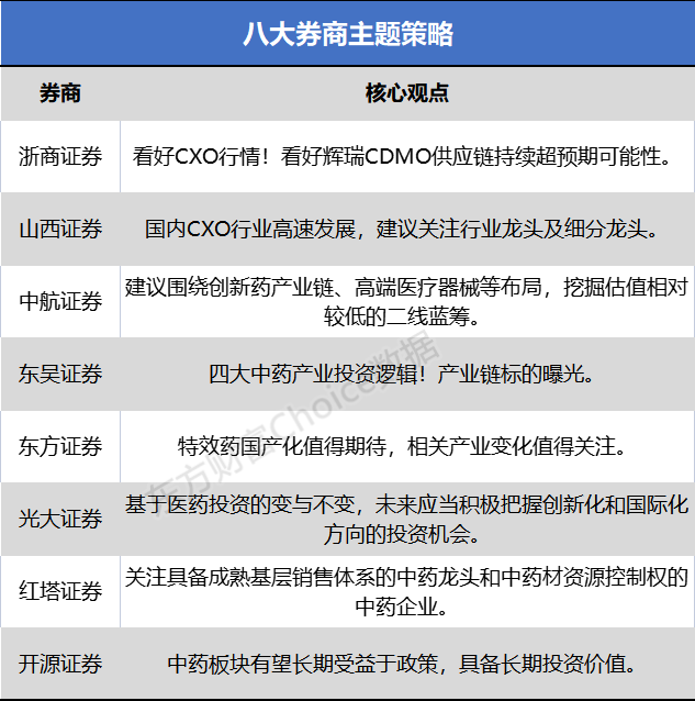 【八大券商主题策略:“吃药”行情又起风!CXO、中药、医疗器械等细分龙头梳理】中航证券表示,长期来看,随着药品、耗材带量采购工作持续推进,安全边际高、创新能力强、产品管线丰富和竞争格局较好的企业有望在长周期持续受益,建议继续围绕创新药产业链、高端医疗器械、医疗服务和医疗消费布局,同时挖掘估值相对较低的二线蓝筹。
