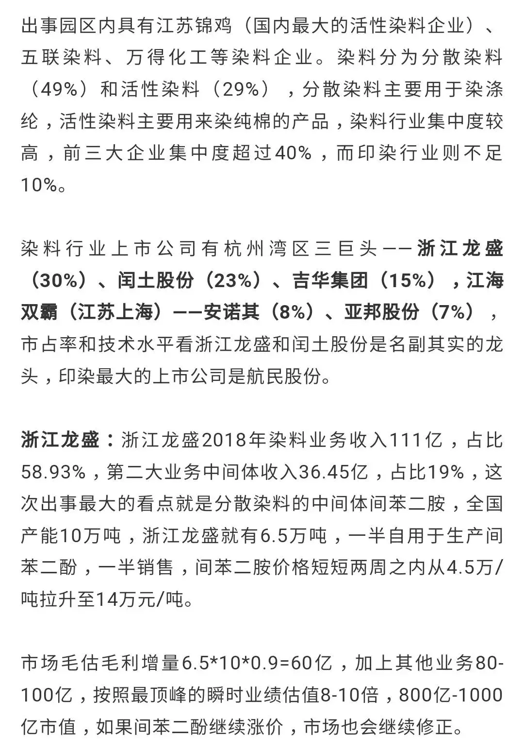 湾区三霸是我国染料行业的中坚力量,产品以分散染料为主、活性染料为辅,产能公开,关于业绩弹性主要是跟踪产品价格涨幅测算。