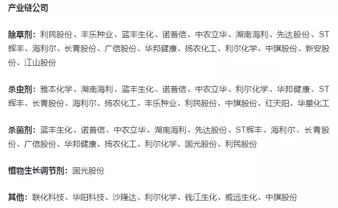 农药包括除草剂、杀虫剂、植物生长调节剂等,产业链包括化工原料→农药中间体→农药原药→农药制剂,也是对环保要求很高的化工行业,重点公司是扬农化工(菊酯等农药产业链),新安股份(草甘膦销量超10万吨),安道麦A(全球第6大农药生产商),和利尔化学(全球草铵膦增量市场持续增长)。