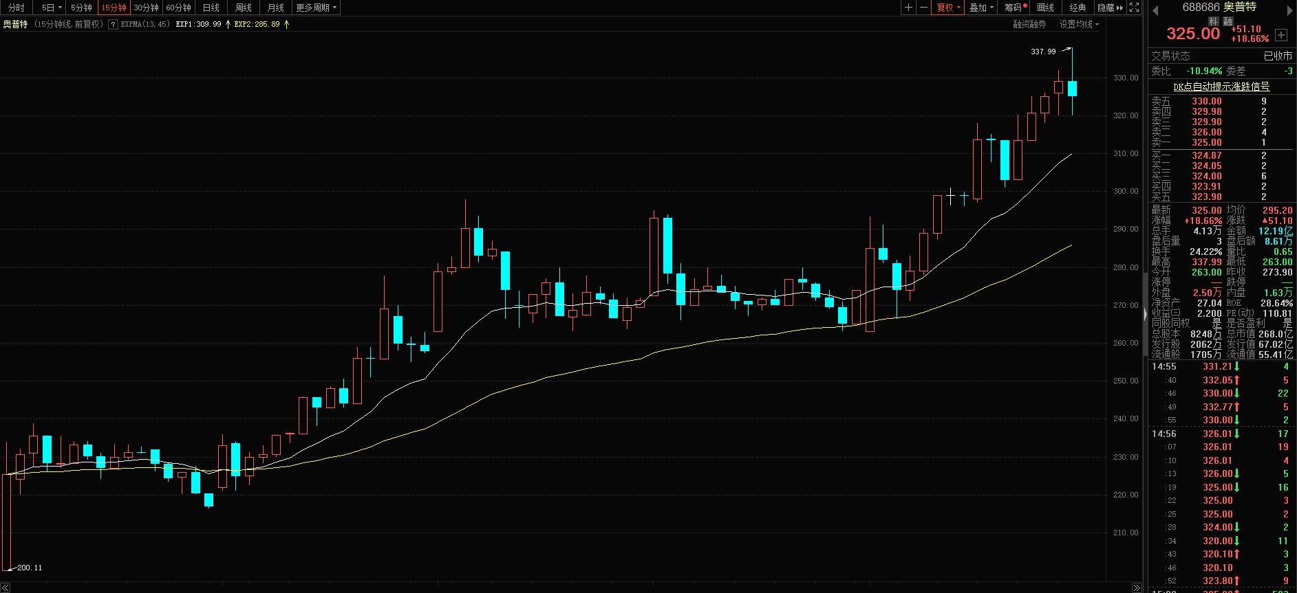 A股上市公司视觉产业链国产化龙头股奥普特自上市后稳步震荡上行,可以将15分钟周期的参数为13以及参数为45的指数平均线作为趋势及多空研判依据。